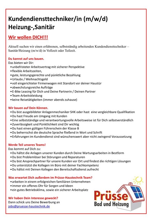 Kundendiensttechniker für Sanitär-, und Heizungstechnik (m/w/d)