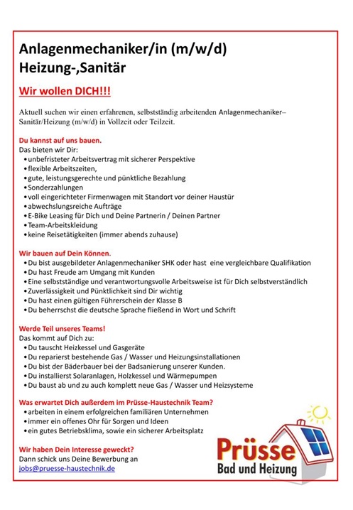 Anlagenmechaniker für Sanitär-, und Heizungstechnik (m/w/d)